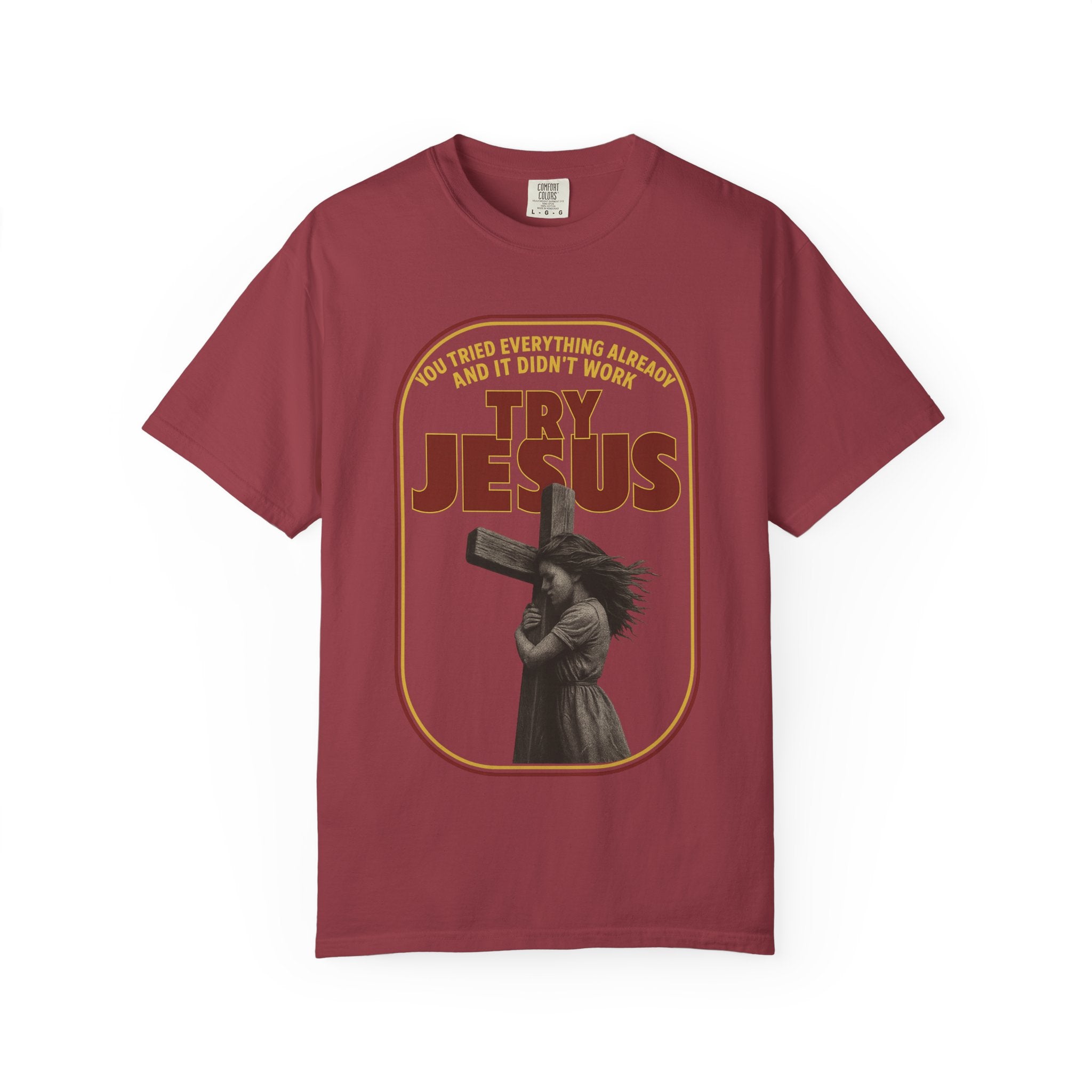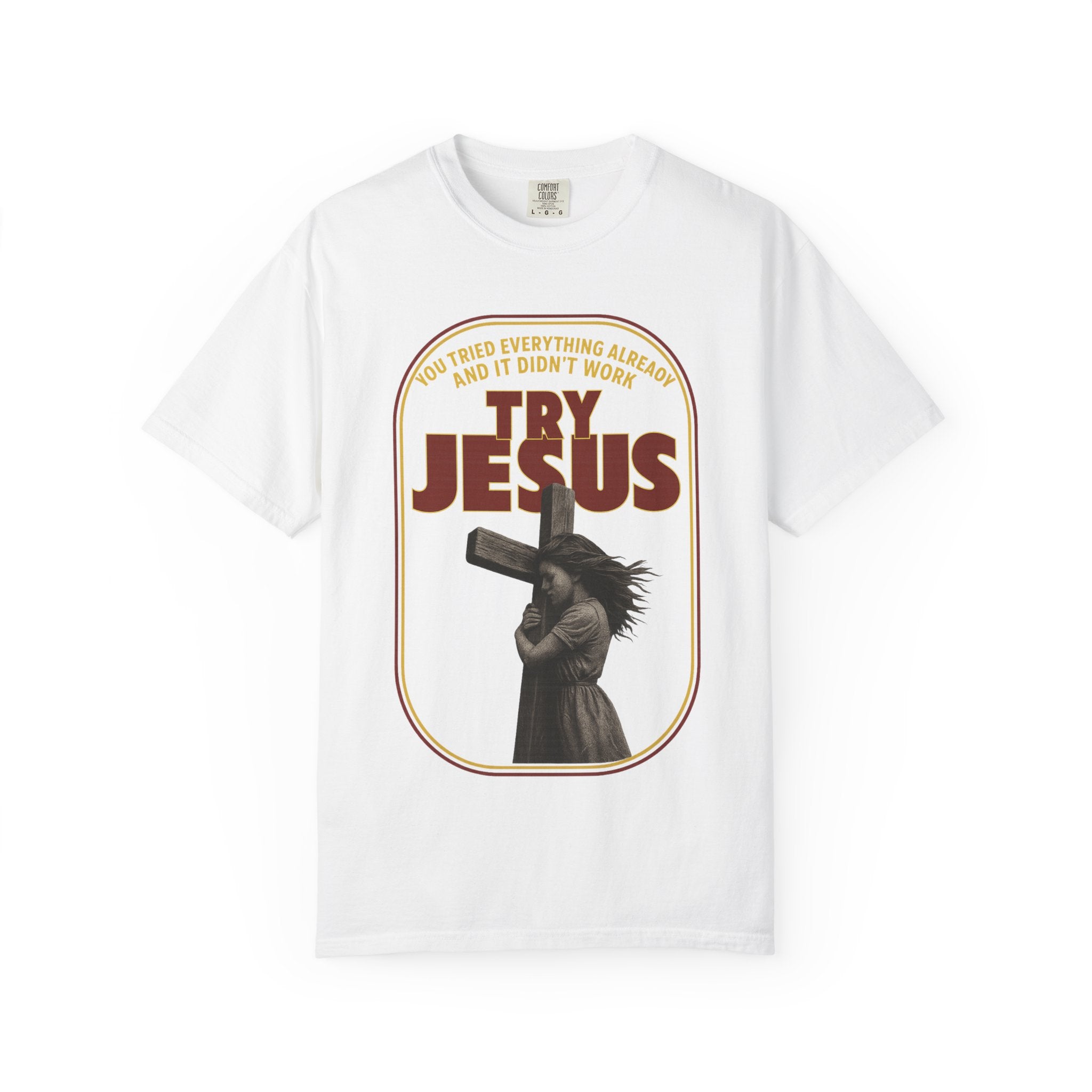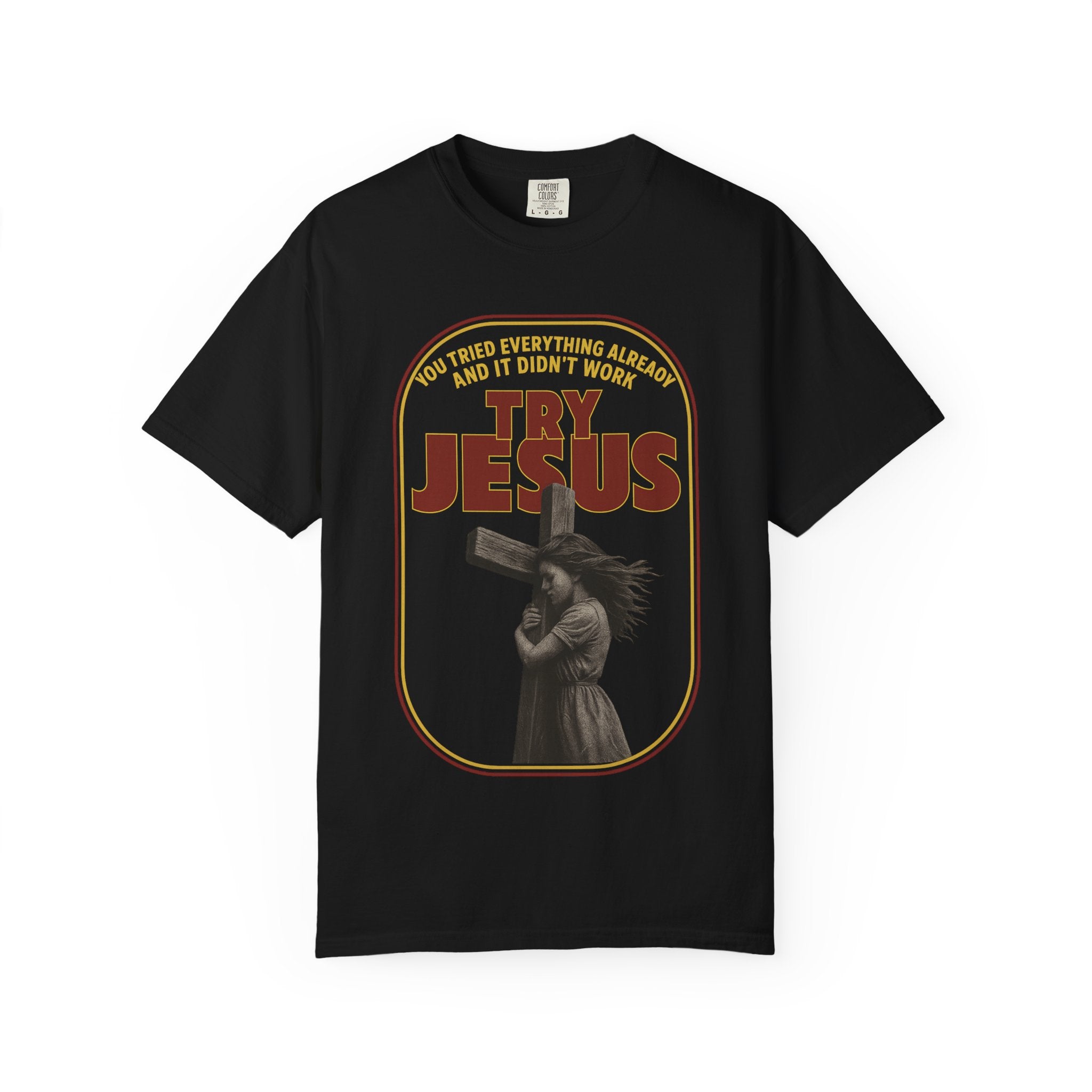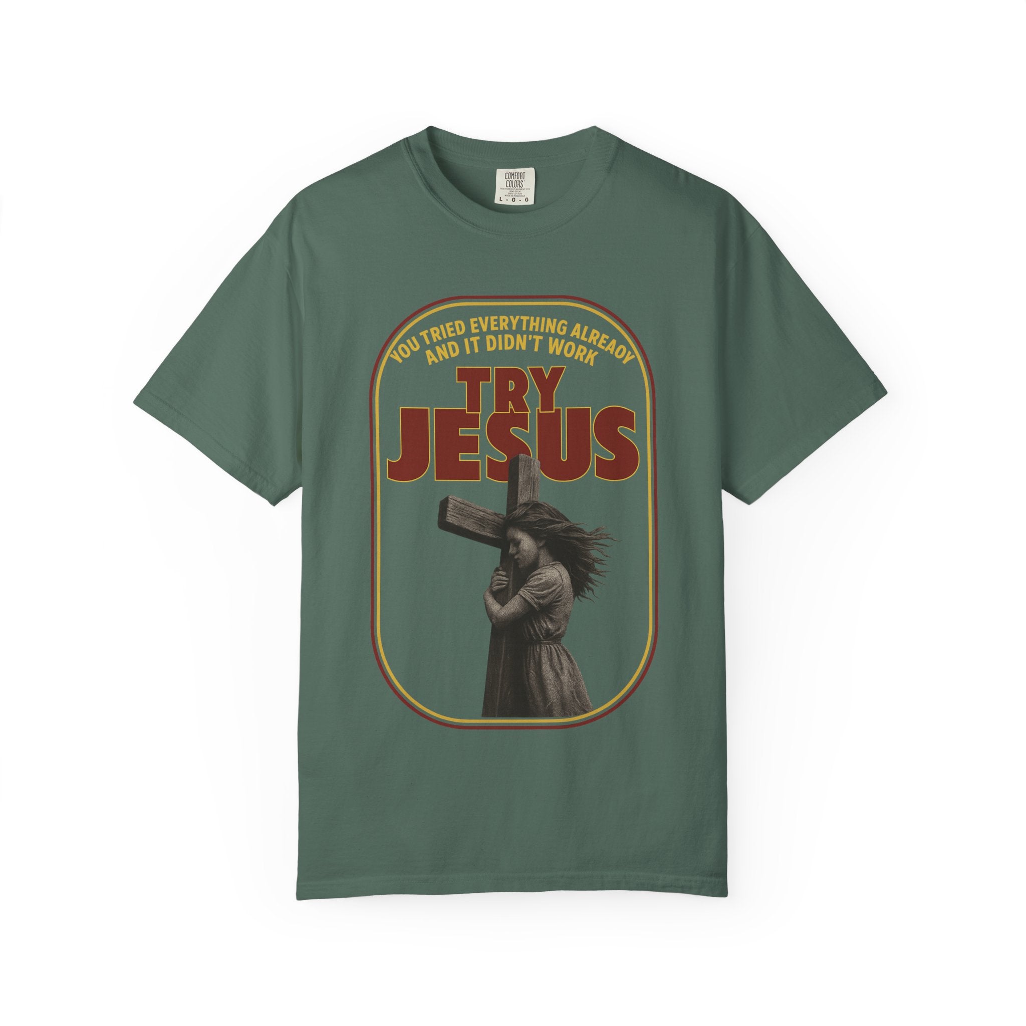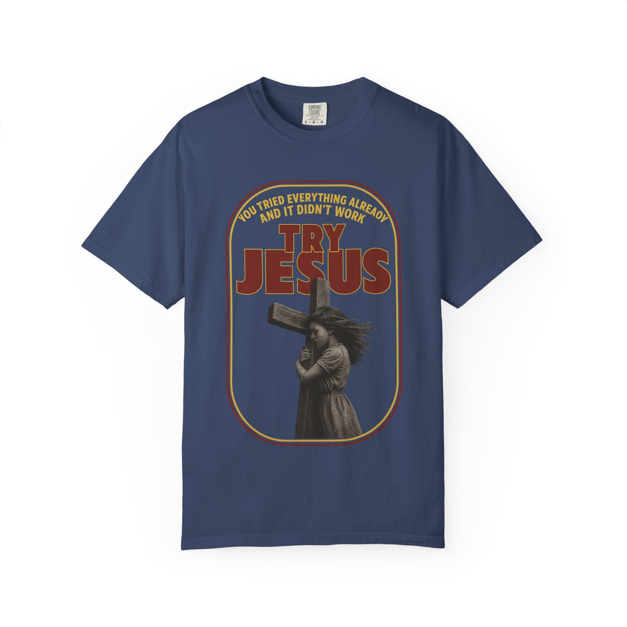 The Try Jesus Garment-Dyed T-shirt challenges you to take a leap of faith with uncompromising style. Crafted from 100% ring-spun cotton, this tee delivers a soft-washed, garment-dyed experience that wraps you in authentic comfort. The relaxed fit refuses to constrain, while reinforced double-needle stitching and seamless construction guarantee this shirt outlasts the ordinary. Pre-shrunk and built to endure, it's more than apparel—it's a declaration. When everything else falls short, wear your conviction boldly.