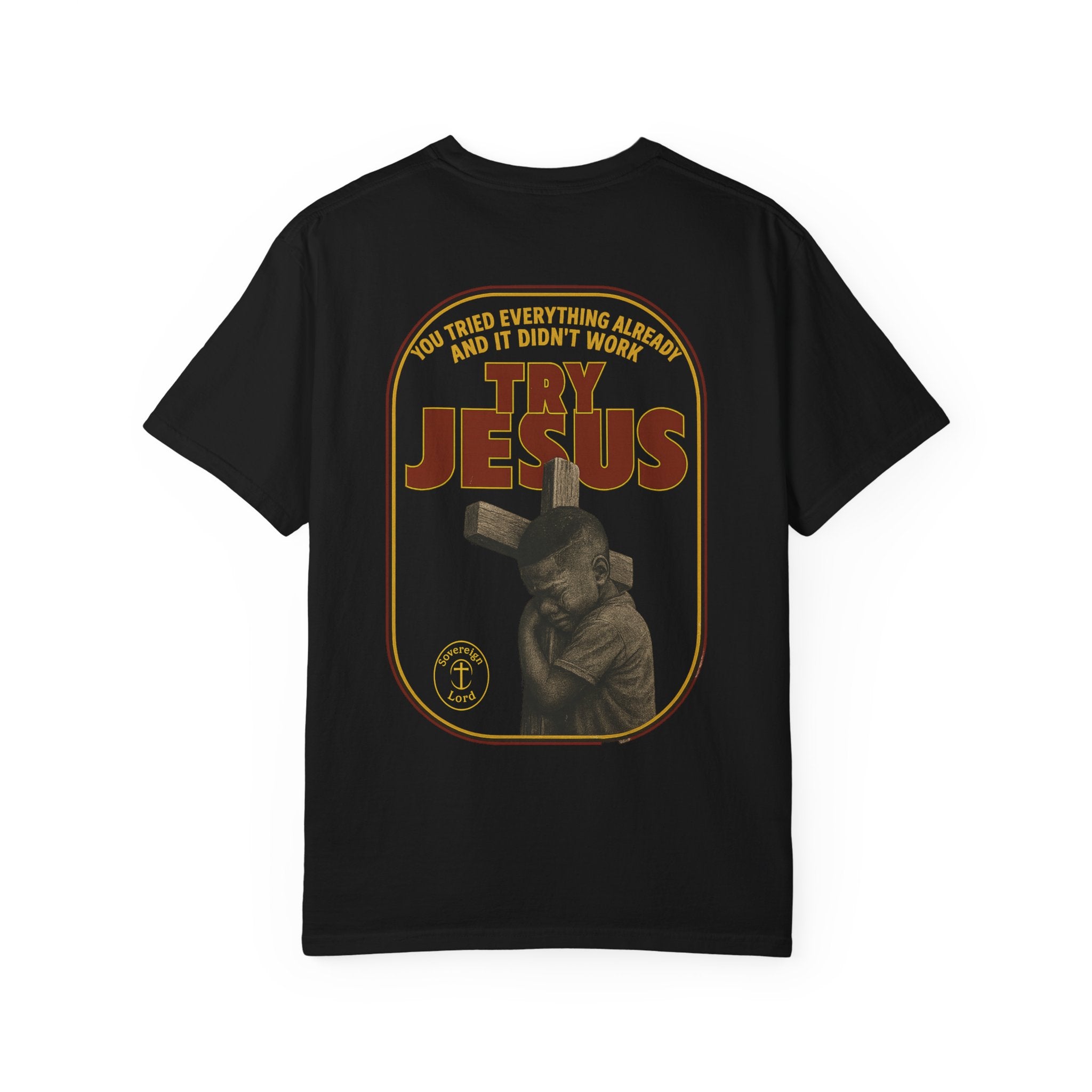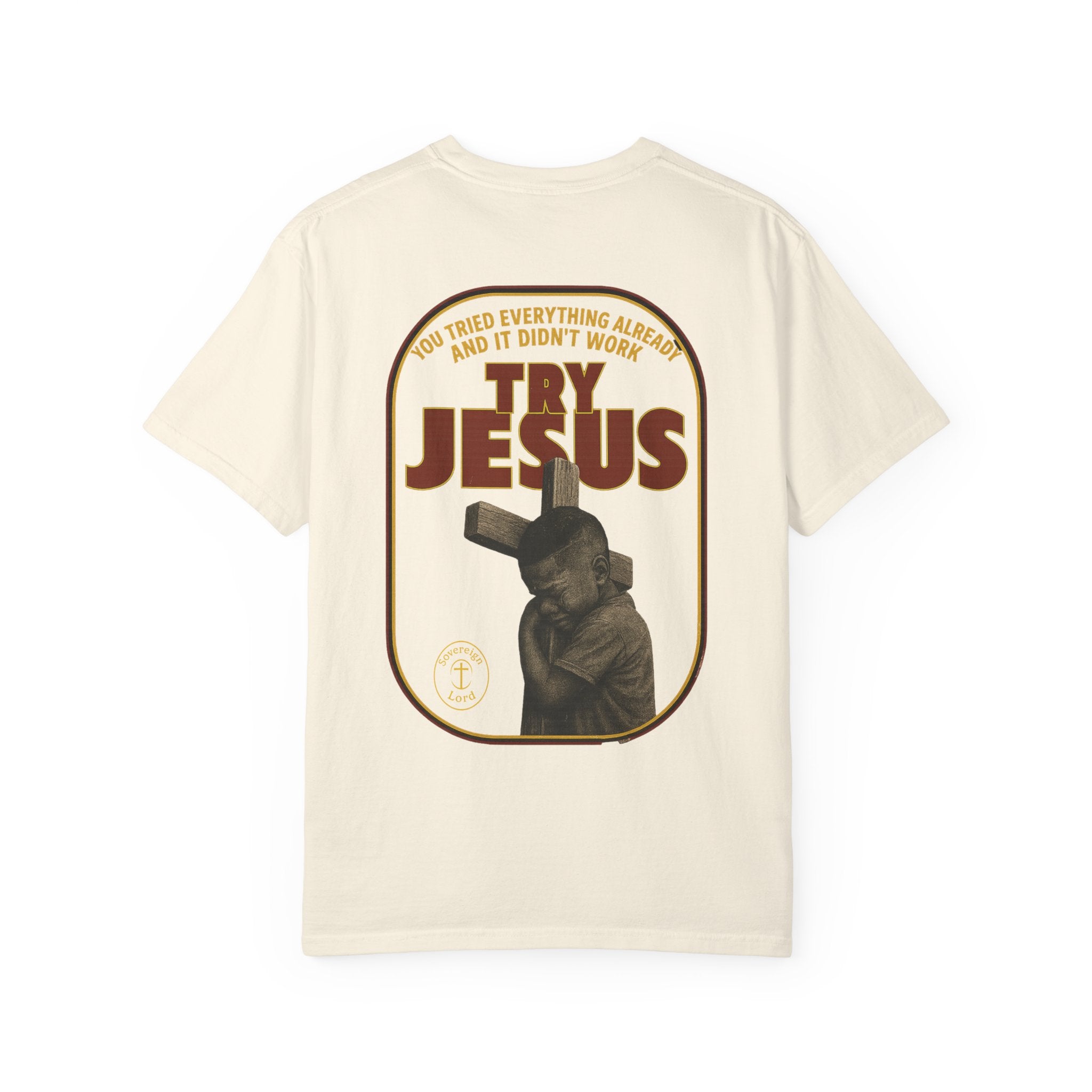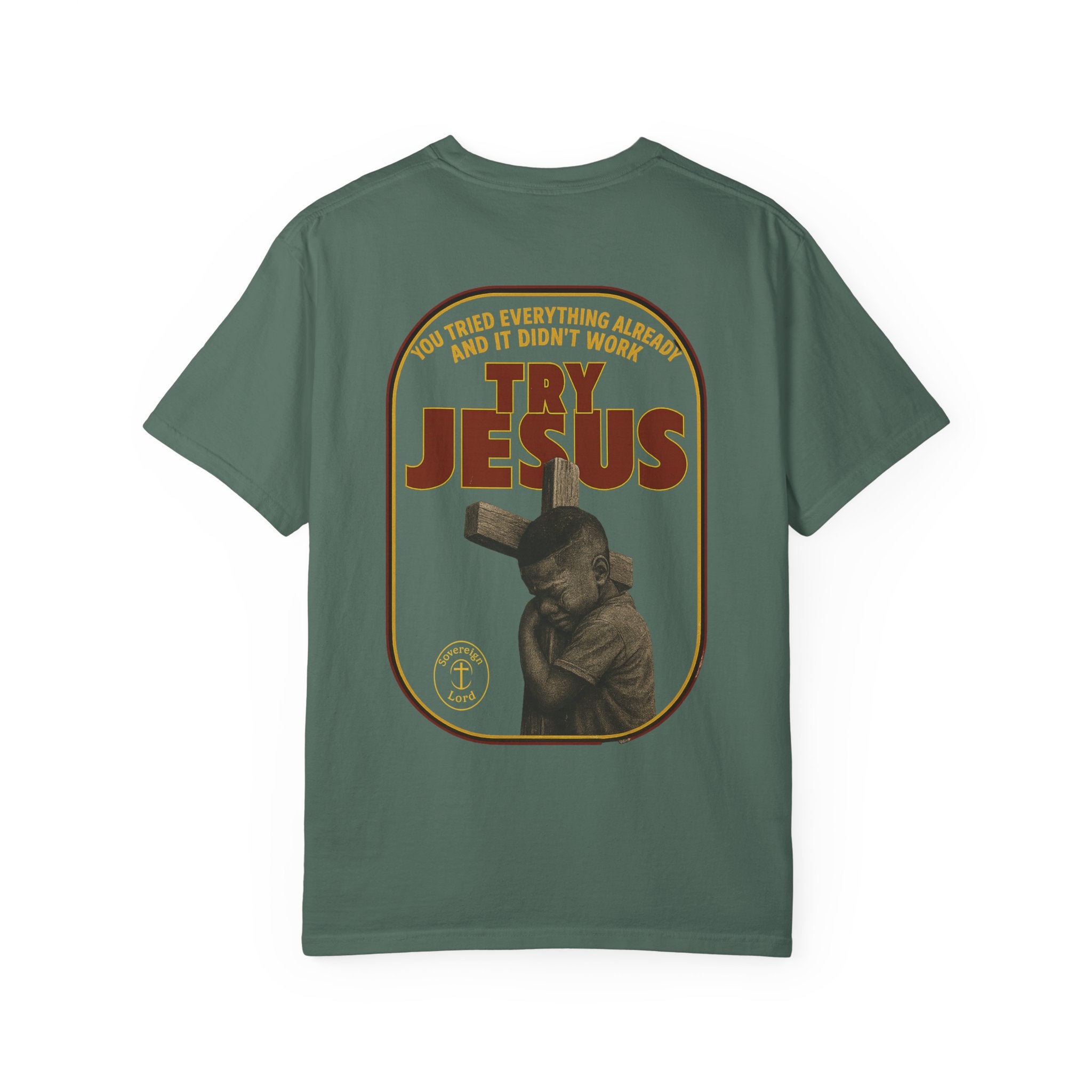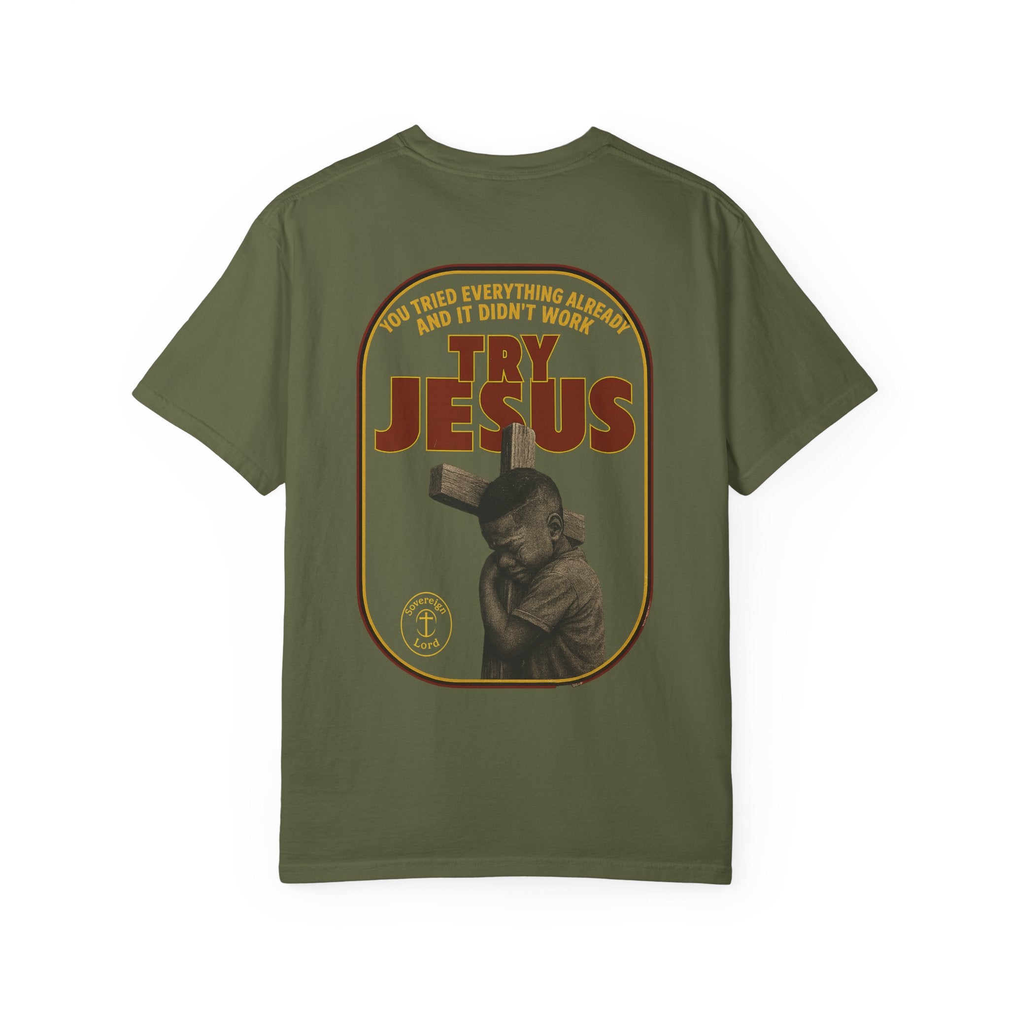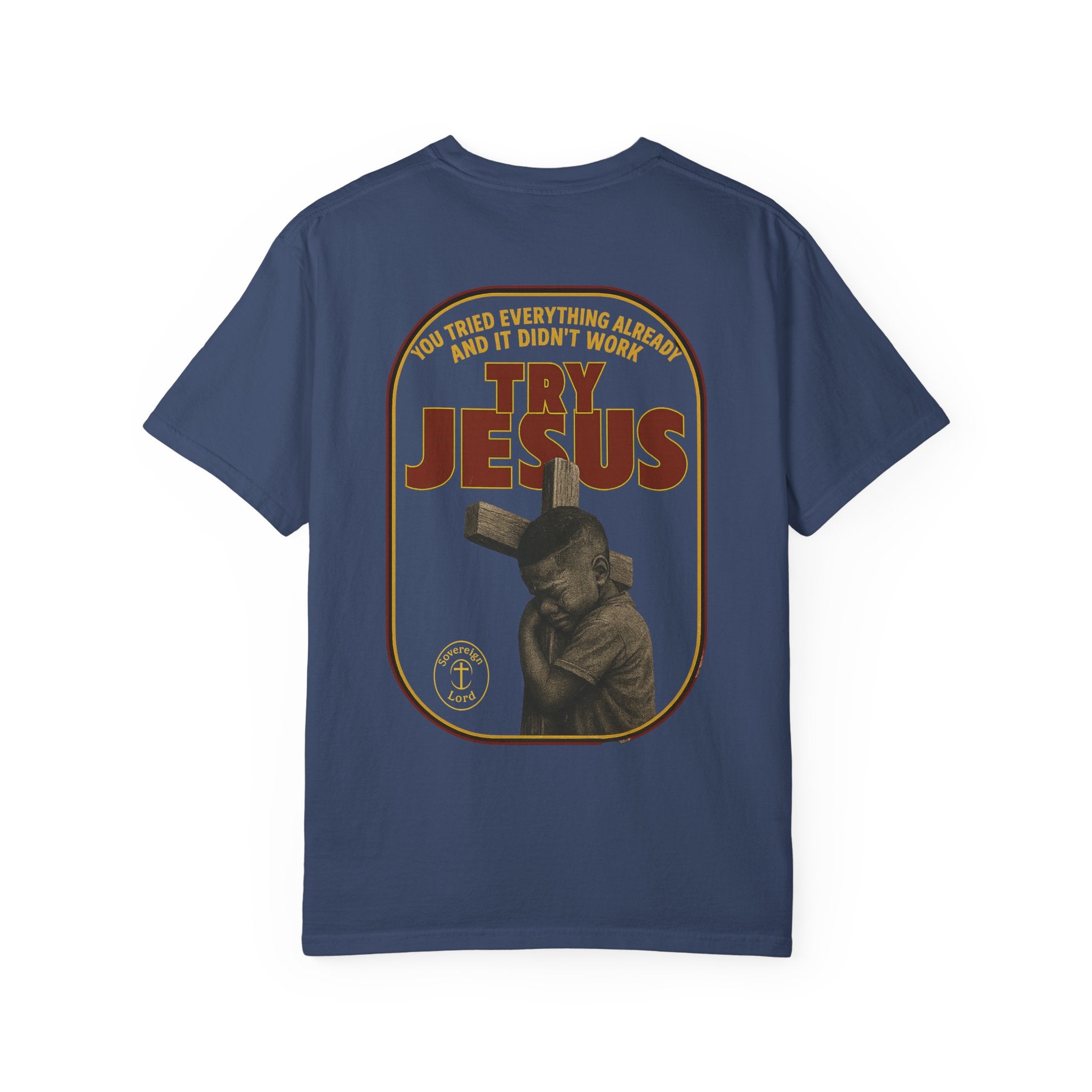 The Try Jesus Garment-Dyed T-shirt challenges you to take a leap of faith with uncompromising style. Crafted from 100% ring-spun cotton, this tee delivers a soft-washed, garment-dyed experience that wraps you in authentic comfort. The relaxed fit refuses to constrain, while reinforced double-needle stitching and seamless construction guarantee this shirt outlasts the ordinary. Pre-shrunk and built to endure, it's more than apparel—it's a declaration. When everything else falls short, wear your conviction boldly.